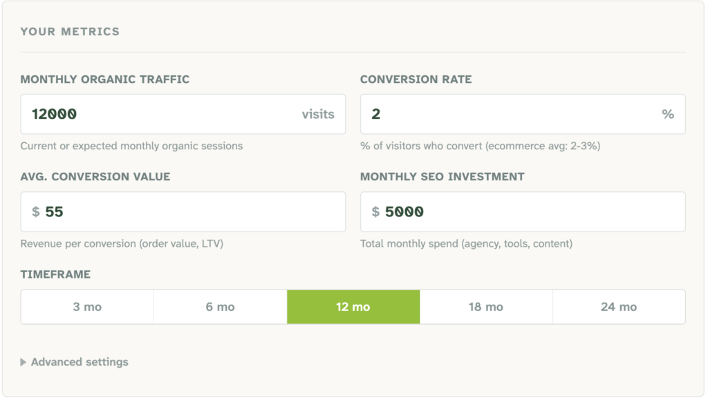 Timeframe lets you choose how far ahead you want to forecast. We recommend at least 12 months, as SEO takes time to see real results. Short timeframes often show you negative ROI, simply because SEO hasn’t had enough time to build momentum.
